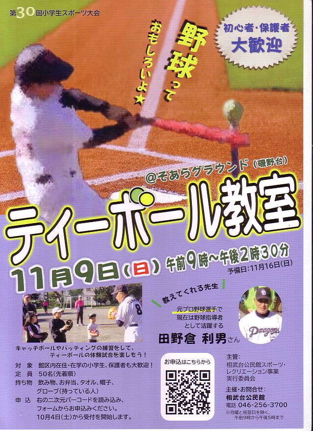 下記ポスターの通り「ティーボール教室」を開催します