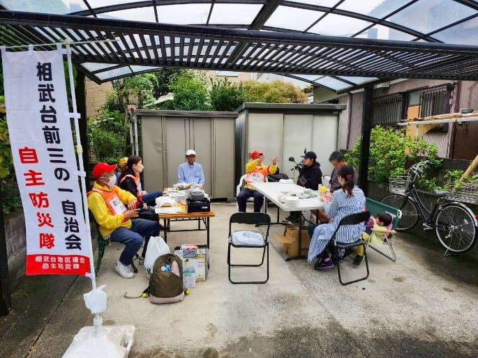 相武台前3の1自治会にて、自主防災活動の一環として、会員宅のガレージを災害対応拠点に見立て、防災炊出し体験会を行いました。