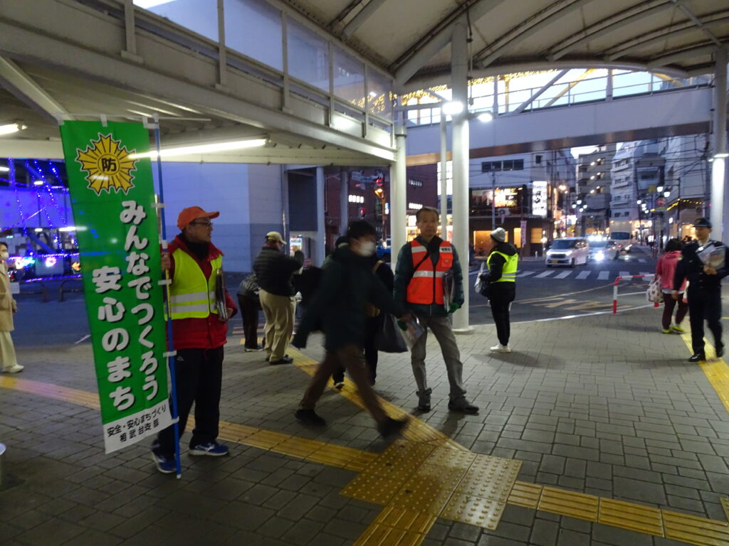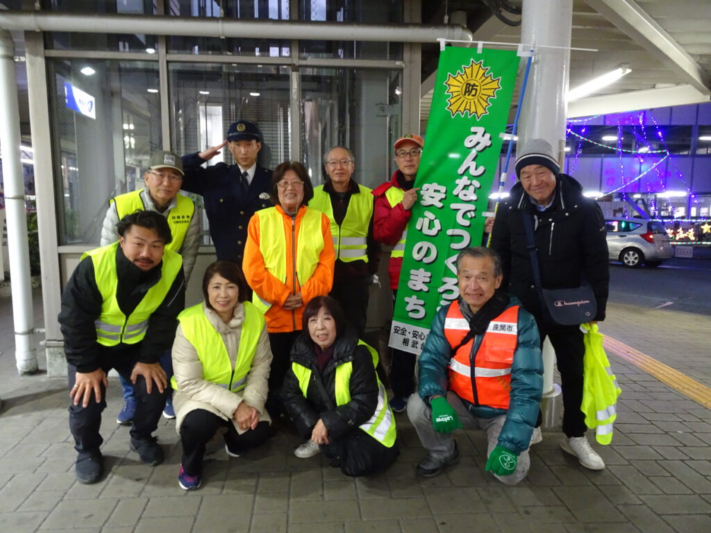 12月19日(金)、年末の交通事故防止運動と年末年始特別警戒の啓発活動を実施しました。南区安全・安心まちづくり推進協議会相武台支部と、座間市相武台自治会、座間市相武台商店会、相模原市相武台商店街と協働して毎年、小田急相武台前駅にて行っています。市は違ってもお隣同士、相武台地域全体の安全・安心のための活動は今回で3回目となりました。相模原南警察署生活安全課の署員の方にもご協力いただき、通勤・通学帰りの皆さんに、自転車の窃盗や特殊詐欺の防止、自転車のながらスマホ、酒気帯び運転の罰則強化等を伝えました。