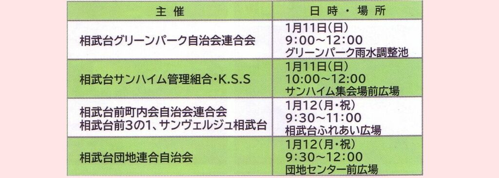 今年も、下記の通り4会場でどんど焼きを行いますので、お越しください。